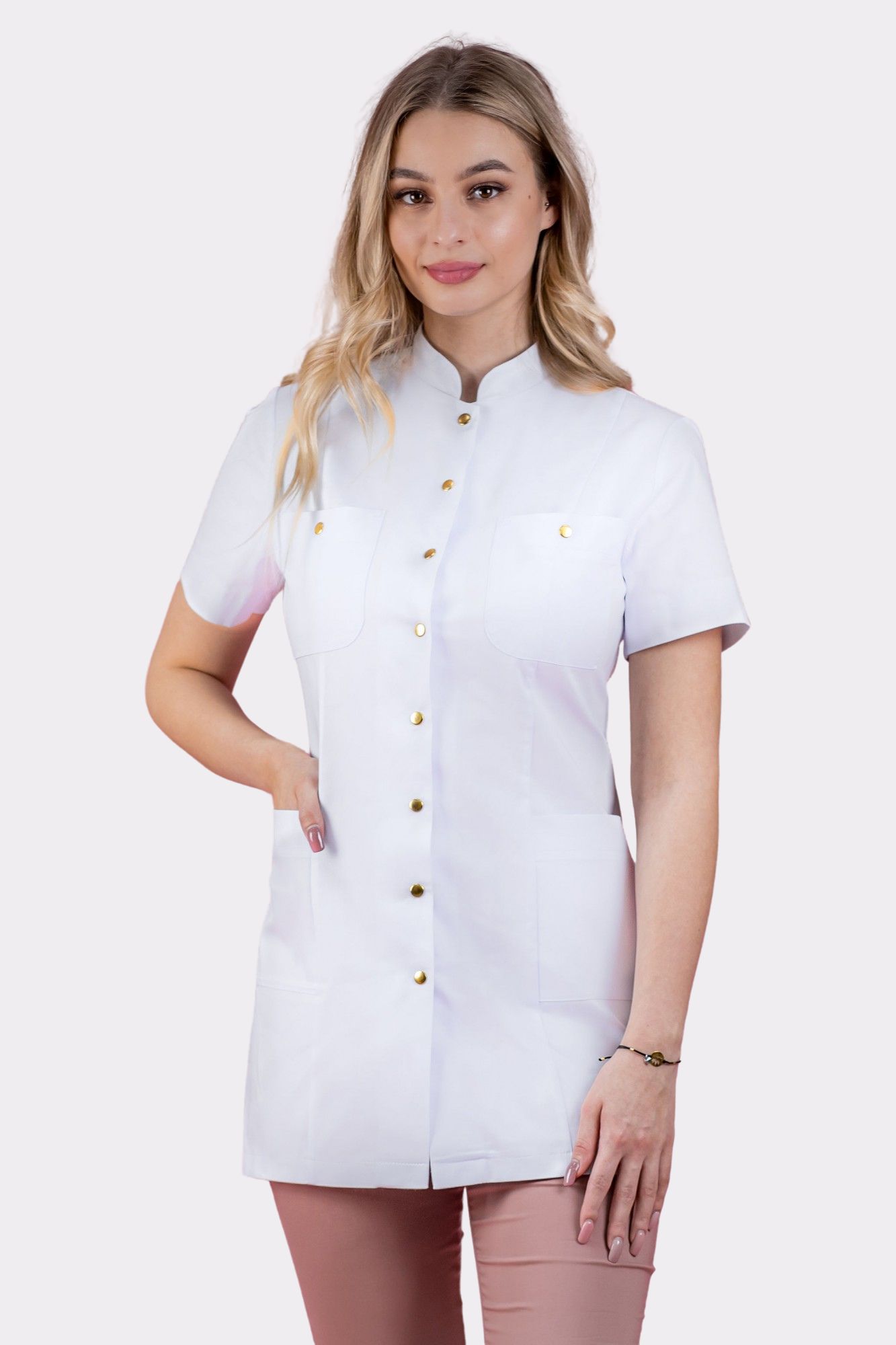 Przepiękna tunika kosmetyczna ze stójką zapinana na eleganckie i łatwe w zapinaniu, złote zatrzaski. Fartuszek kosmetyczny posiada również złote zatrzaski na kieszonkach, które dodają uroku i ożywiają strój. Uniform ma piękny i taliowany krój, który nie opina, jednak jednocześnie podkreśla kobiecą sylwetkę. Wygodne rękawki nie krępują ruchów podczas wykonywanych zabiegów. Fartuch kosmetyczny posiada także dwie boczne i bardzo praktyczne kieszonki, niezwykle przydatne w codziennej pracy. PRoste zapięcie dodaje klasy i szyku. Profesjonalną stylizację z fartuszkiem nr 113 dopełnią spodnie typu rurki z wyższym stanem model 55 dostępne w kilku kolorach. Odzież kosmetyczna ma duży wpływ na profesjonalny odbiór Twojego salonu i gabinetu, więc nie zwlekaj i bądź Królową w pracy! :)