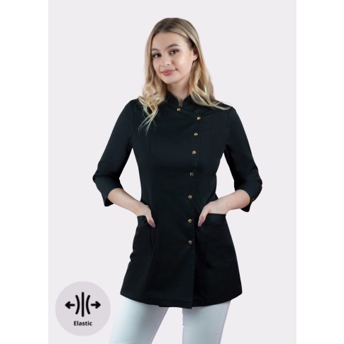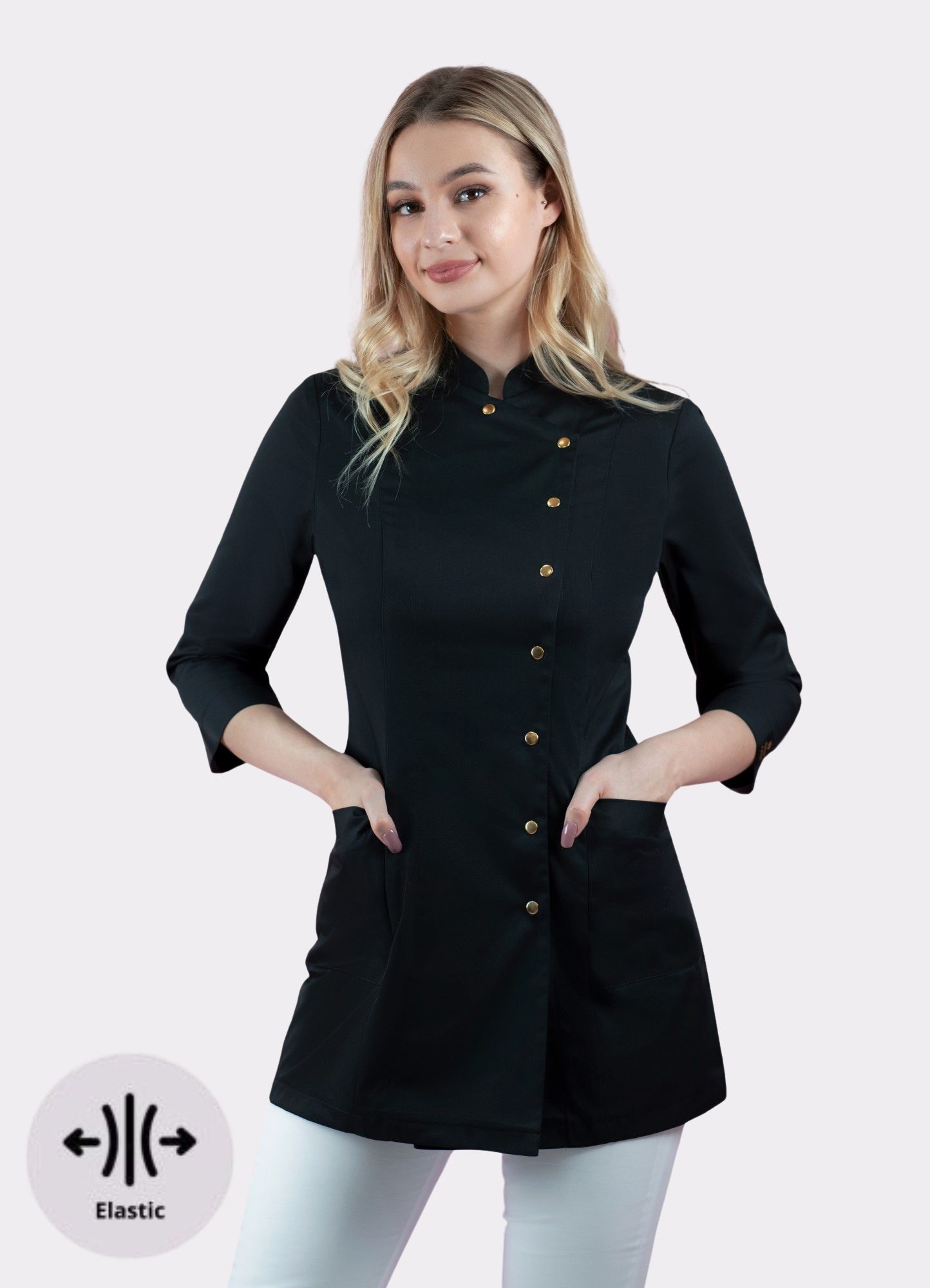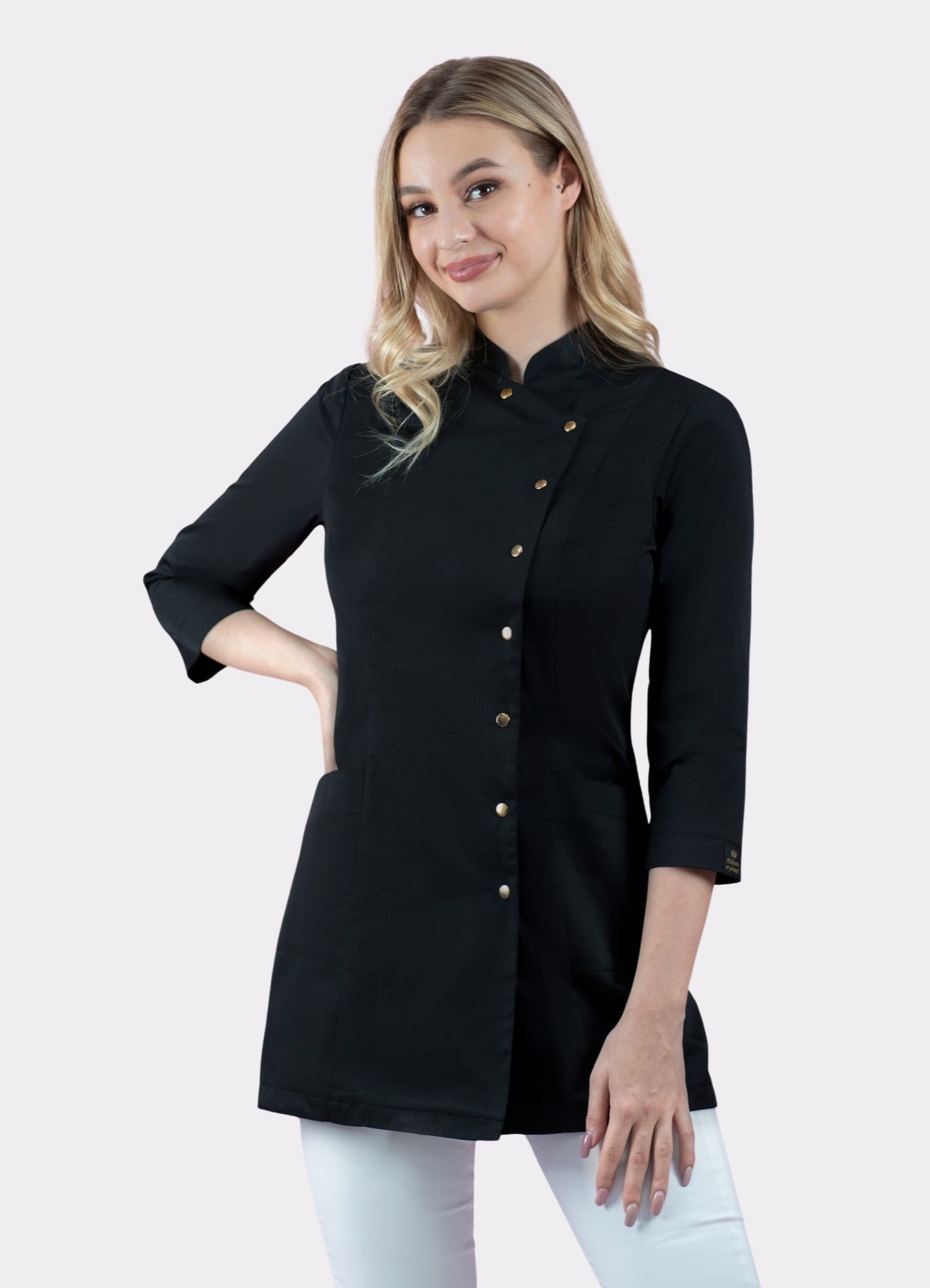 Cudowny fartuszek kosmetyczny ze stójką zapinany na wygodne i łatwe w zapinaniu złote zatrzaski. Uniform w kolorze morskim ma piękny i taliowany krój, który nie opina sylwetki, jednak jednocześnie podkreśla kobiecą figurę. Wygodne rękawki 3/4 nie krępują ruchów podczas wykonywanych zabiegów. Tunika kosmetyczna posiada także dwie boczne i bardzo praktyczne kieszonki, niezwykle przydatne w codziennej pracy. Boczne zapięcie dodaje klasy i szyku. Odzież kosmetyczna ma duży wpływ na profesjonalny odbiór Twojego salonu i gabinetu, więc nie zwlekaj i bądź Królową w pracy! :)