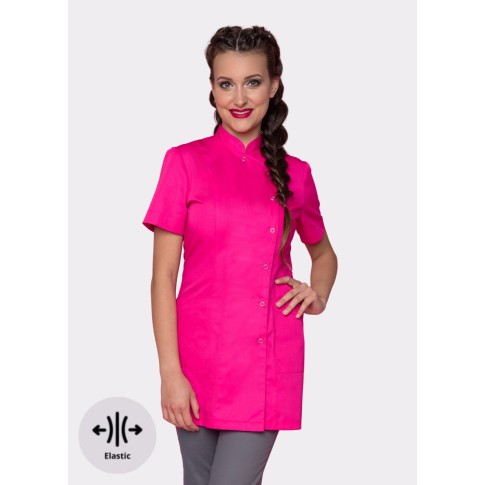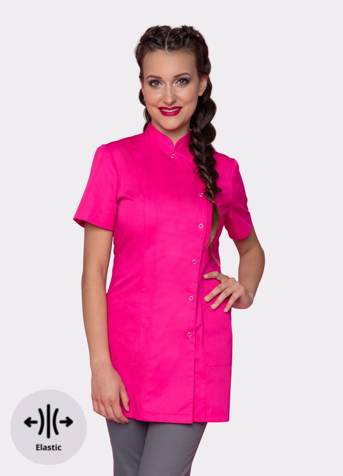 Cudowny fartuszek kosmetyczny ze stójką zapinany na wygodne i łatwe w zapinaniu zatrzaski. Uniform ma piękny i taliowany krój, który nie opina sylwetki, jednak jednocześnie podkreśla kobiecą figurę. Wygodne rękawki nie krępują ruchów podczas wykonywanych zabiegów. Tunika kosmetyczna posiada także dwie boczne i bardzo praktyczne kieszonki, niezwykle przydatne w codziennej pracy kosmetyczki. Boczne zapięcie dodaje klasy i szyku.