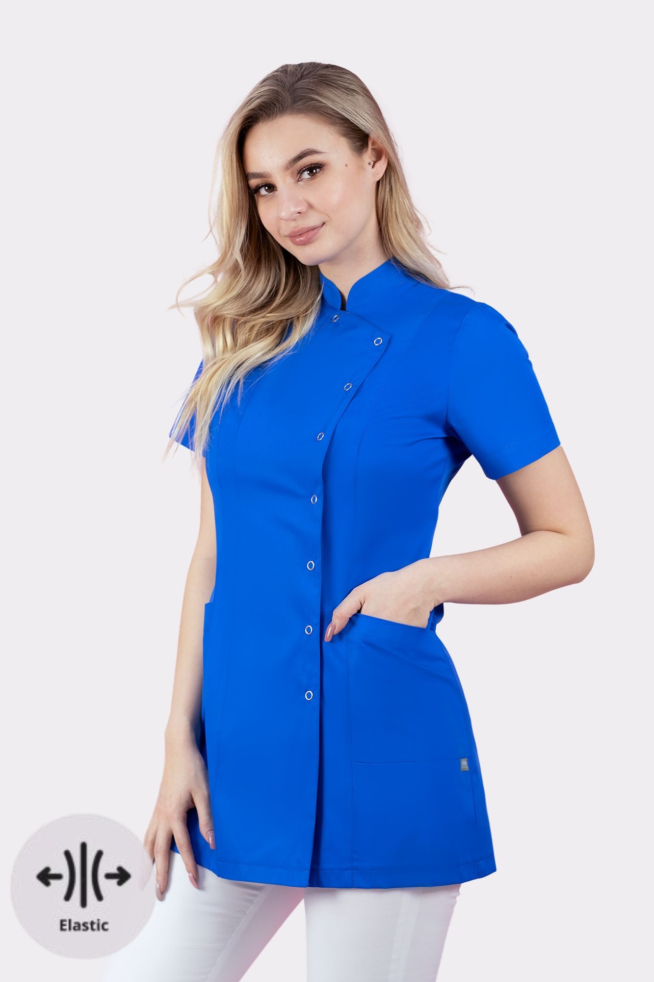 Cudowny fartuszek kosmetyczny ze stójką zapinany na wygodne i łatwe w zapinaniu zatrzaski. Uniform ma piękny i taliowany krój, który nie opina sylwetki, jednak jednocześnie podkreśla kobiecą figurę. Wygodne rękawki nie krępują ruchów podczas wykonywanych zabiegów. Tunika kosmetyczna posiada także dwie boczne i bardzo praktyczne kieszonki, niezwykle przydatne w codziennej pracy kosmetyczki. Boczne zapięcie dodaje klasy i szyku.