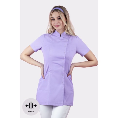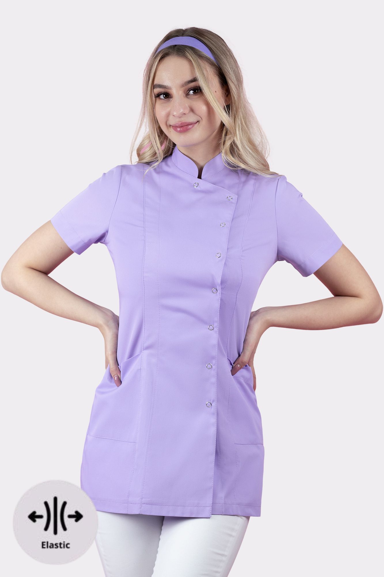 Cudowny fartuszek kosmetyczny ze stójką zapinany na wygodne i łatwe w zapinaniu zatrzaski. Uniform ma piękny i taliowany krój, który nie opina sylwetki, jednak jednocześnie podkreśla kobiecą figurę. Wygodne rękawki nie krępują ruchów podczas wykonywanych zabiegów. Tunika kosmetyczna posiada także dwie boczne i bardzo praktyczne kieszonki, niezwykle przydatne w codziennej pracy kosmetyczki. Boczne zapięcie dodaje klasy i szyku.