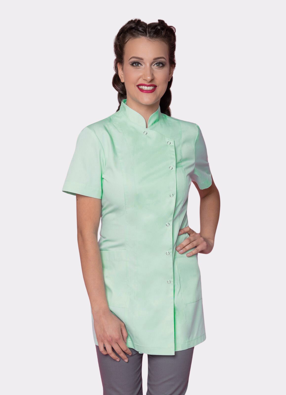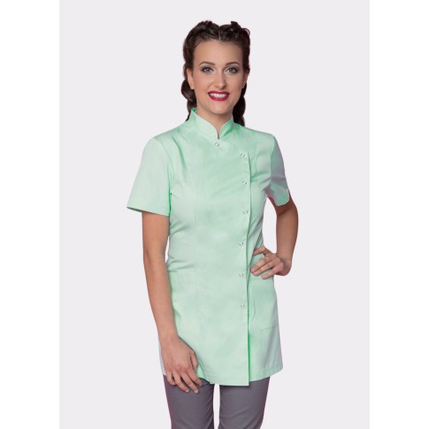 Model ze stójką, zapinany na praktyczne zatrzaski, zachwyca dopracowanym krojem – delikatnie taliowany, pięknie układa się na sylwetce, nie opinając jej, a jednocześnie subtelnie podkreśla kobiece kształty. Fartuszek posiada wygodne rękawki, które nie ograniczają ruchów podczas wykonywania zabiegów, co zapewnia maksymalny komfort nawet przez cały dzień pracy. Boczne zapięcie nadaje całości nowoczesnego i szykownego wyglądu. Praktyczne detale, takie jak dwie boczne kieszenie sprawiają, że najpotrzebniejsze akcesoria masz zawsze pod ręką.