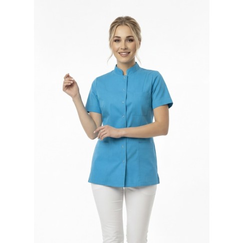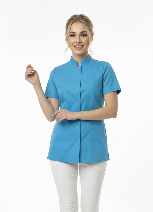 Klasyczny fartuszek kosmetyczny ze stójką zapinany na wygodne i łatwe w zapinaniu srebrne zatrzaski. Uniform ma piękny i taliowany krój, który nie opina sylwetki, jednak jednocześnie podkreśla kobiecą figurę. Wygodne rękawki nie krępują ruchów podczas wykonywanych zabiegów. Fartuszek medyczny posiada także praktyczne kieszonki: dwie boczne i jedną górną, niezwykle przydatne w codziennej pracy. Profesjonalną stylizację z fartuszkiem dopełnią spodnie typu rurki z wyższym stanem model 55 dostępne w kilku kolorach. Odzież kosmetyczna ma duży wpływ na profesjonalny odbiór Twojego salonu i gabinetu, więc nie zwlekaj i bądź Królową w pracy! :)