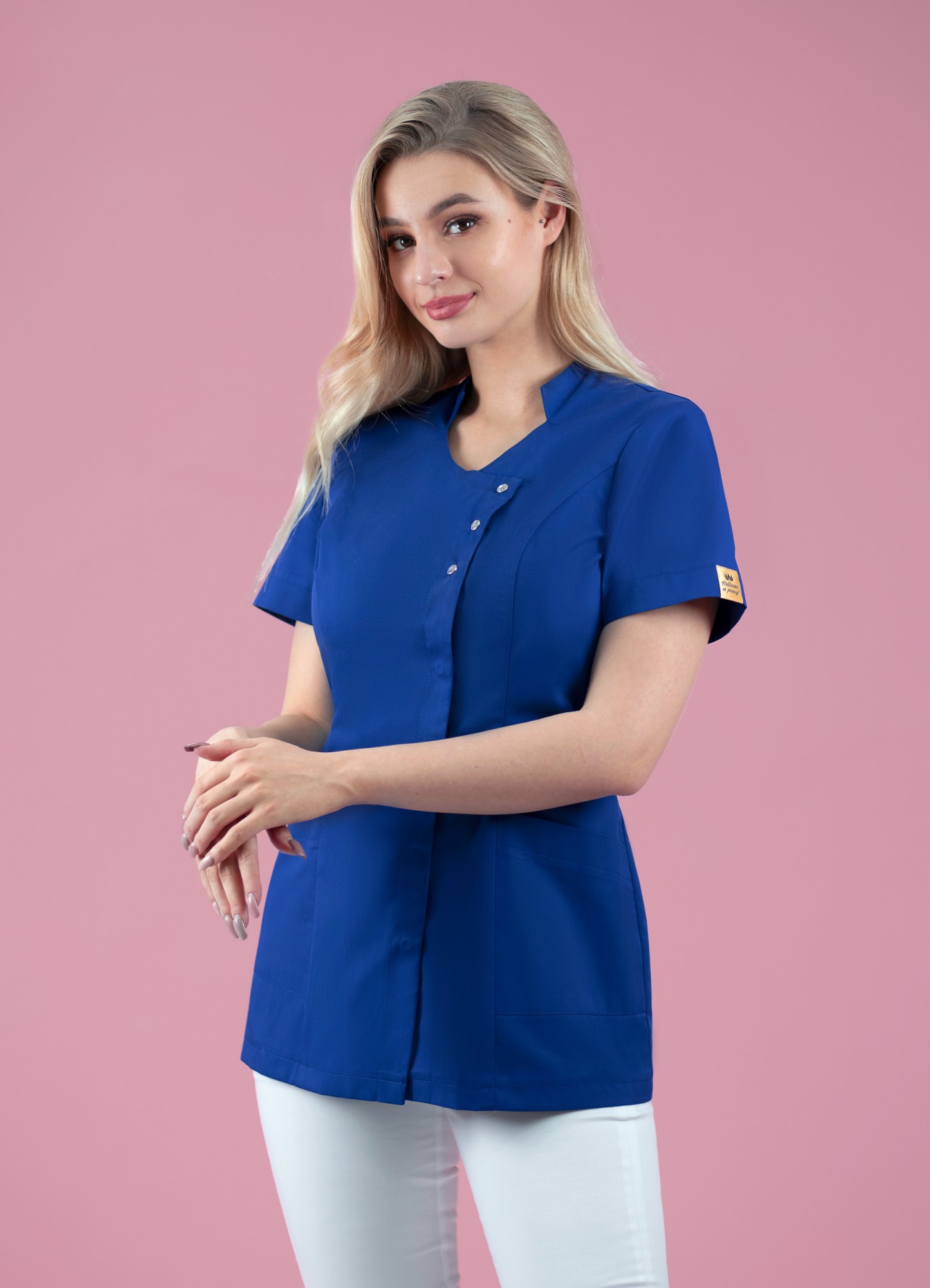 Najnowszy fartuszek kosmetyczny w wersji glamour, to propozycja zarówno dla gabinetów kosmetycznych jak i medycznych. Okrągły dekolt podkreśla i wydłuża szyję. Wygodne rękawki nie krępują ruchów podczas wykonywanych zabiegów. Ten nietuzinkowy fartuch kosmetyczny posiada także pojemne i bardzo praktyczne podczas pracy kieszonki. Tunika zapinana jest na błyszczące, diamentowe zatrzaski-cyrkonie. Bardzo łatwe w zapinaniu i rozpinaniu. Boczne zapięcie tego modelu dodaje klasy i szyku. Uniform jest idealnie taliowany i zgrabny przez co wysmukla kobiecą sylwetkę. Przepięknie dopasowuje się do każdej figury. Odzież kosmetyczna ma duży wpływ na profesjonalny odbiór Twojego salonu i gabinetu, więc nie zwlekaj i bądź Królową w pracy! :)