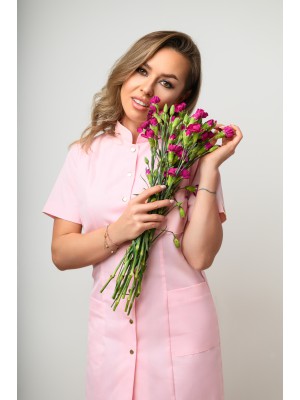 Elegancka sukienka kosmetyczna ze stójką zapinana na wygodne i łatwe w zapinaniu zatrzaski. Uniform ma piękny i taliowany krój, który nie opina sylwetki, jednocześnie podkreśla kobiecą figurę. Wygodne rękawki nie krępują ruchów podczas wykonywanych zabiegów. Sukienka kosmetyczna posiada także dwie boczne i bardzo praktyczne kieszonki, niezwykle przydatne w codziennej pracy kosmetyczki.