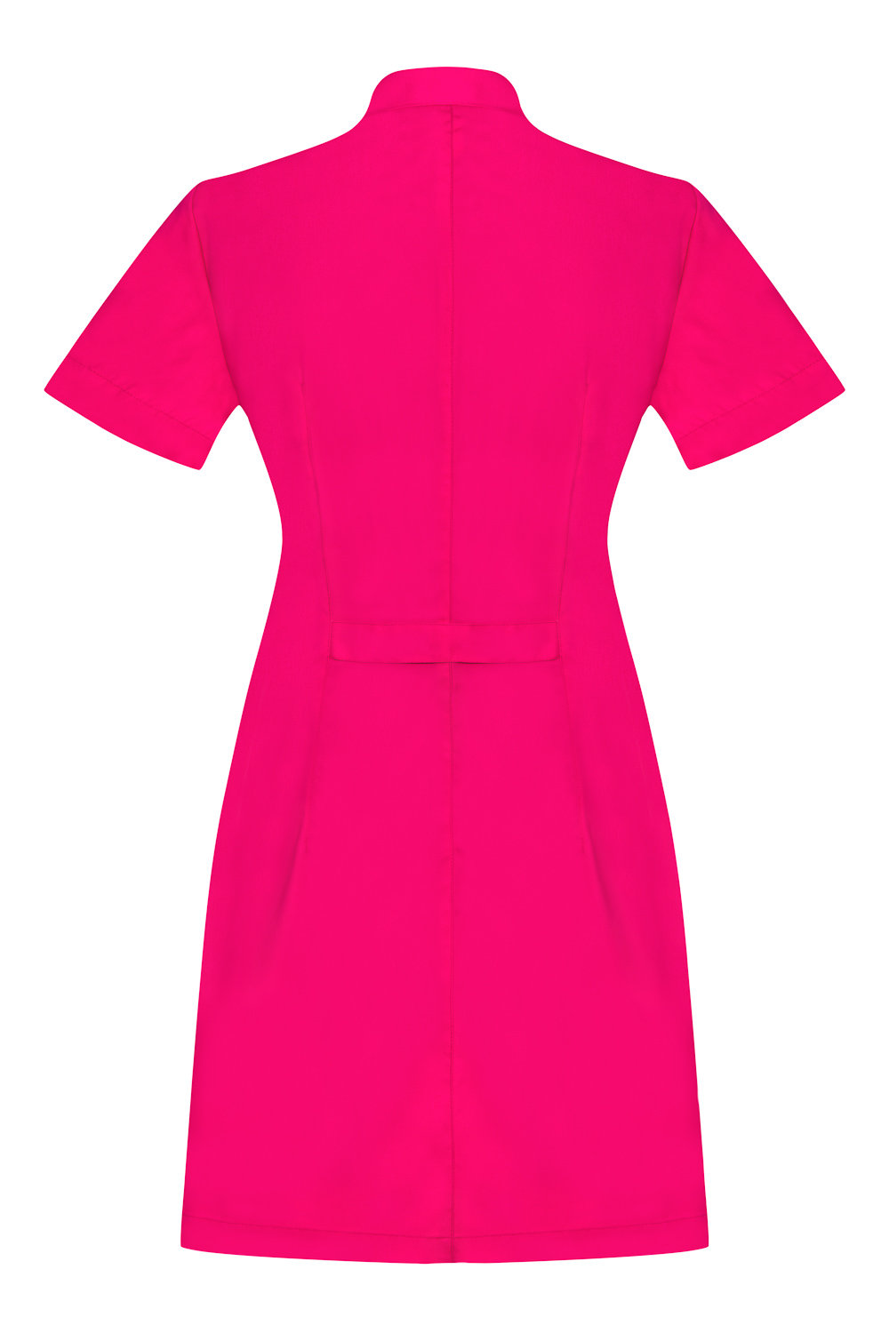 Elegancka sukienka kosmetyczna ze stójką zapinana na wygodne i łatwe w zapinaniu zatrzaski. Uniform ma piękny i taliowany krój, który nie opina sylwetki, jednocześnie podkreśla kobiecą figurę. Wygodne rękawki nie krępują ruchów podczas wykonywanych zabiegów. Sukienka kosmetyczna posiada także dwie boczne i bardzo praktyczne kieszonki, niezwykle przydatne w codziennej pracy kosmetyczki.